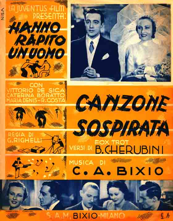 4 - Canzone sospirata : fox trot / lyrics by B. Cherubini ; music by C.A. Bixio. - Milan : Bixio, 1938. - 1 score (2 p.) ; 35 cm. ((From the film Hanno rapito un uomo, Gennaro Righelli, 1938, with Maria Denis, Vittorio De Sica, Romolo Costa, Caterina Boratto, Evelina Paoli, Clara Calamai.
