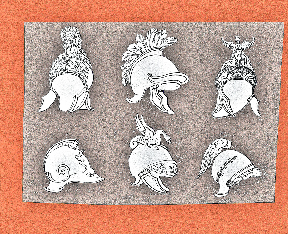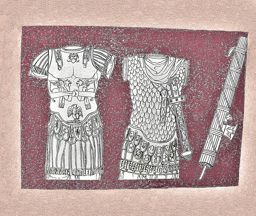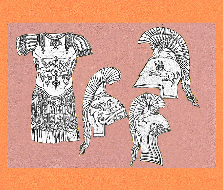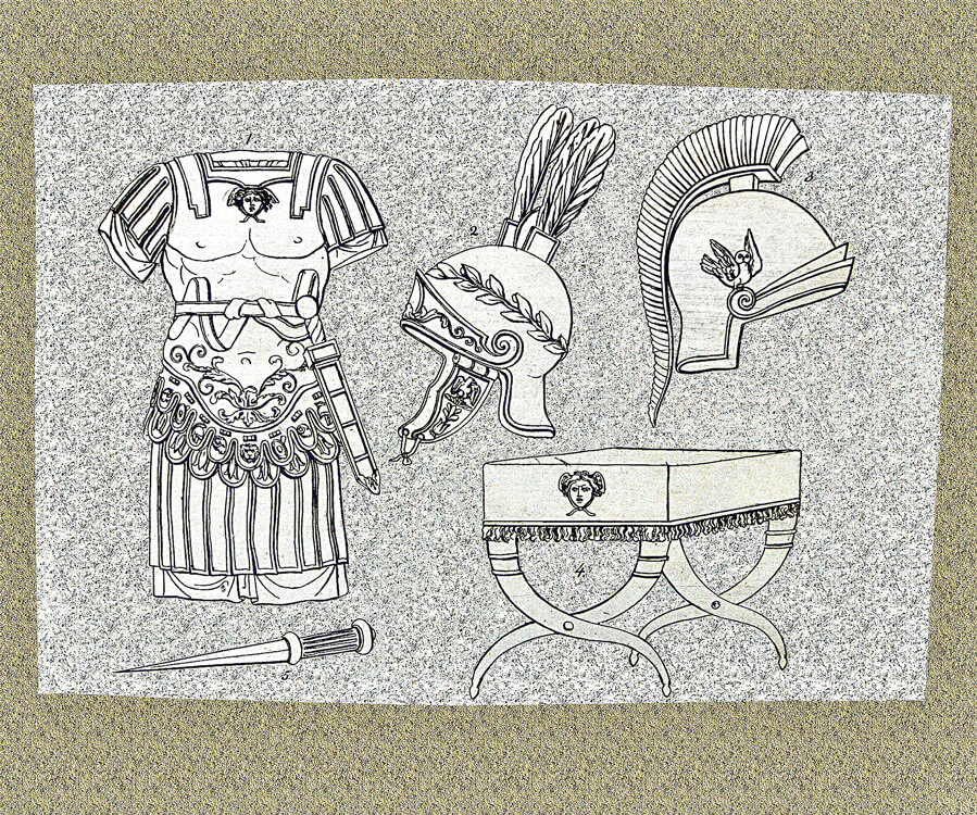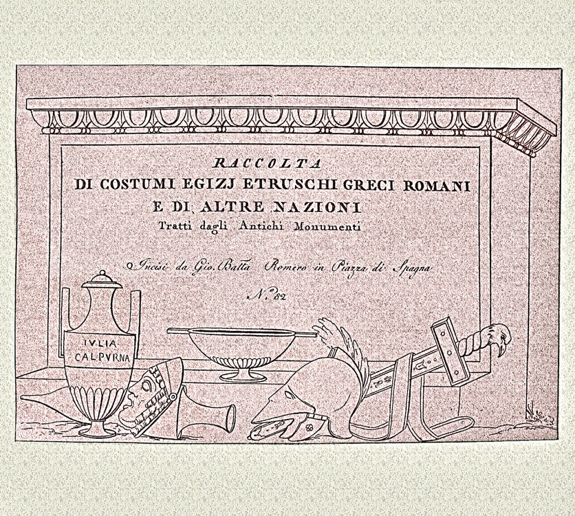 Collection of costumes from Egypt, Greece, Rome and other countries, a rare and precious book containing the engravings made in the late 18th century by Giovan Battista Romero. The engravings reflect the antiquarian taste of the time and were purchased by foreign travelers in Italy, one of the favorite destinations of the Grand Tour. Romero, whose workshop was located in the Piazza di Spagna, reproduced images taken from the bas-reliefs of the monuments of antiquity, with a focus on the weapons and armor worn by the armies of the various peoples: swords, dagger, armour, pilum, shoes, shields, helmets.