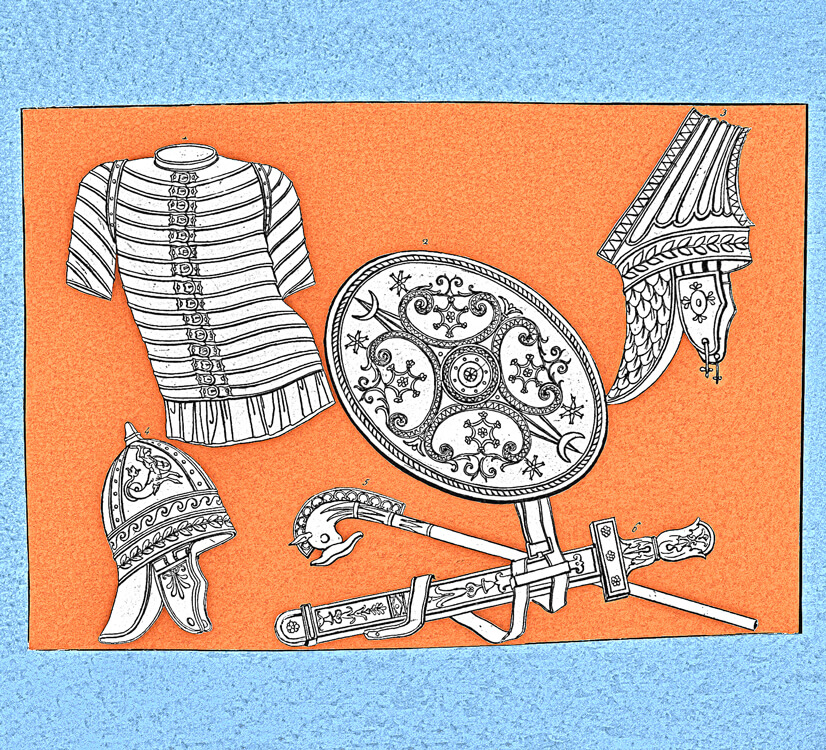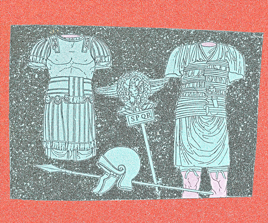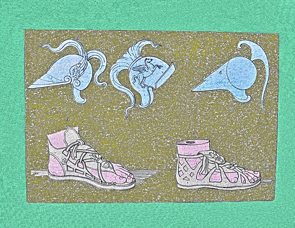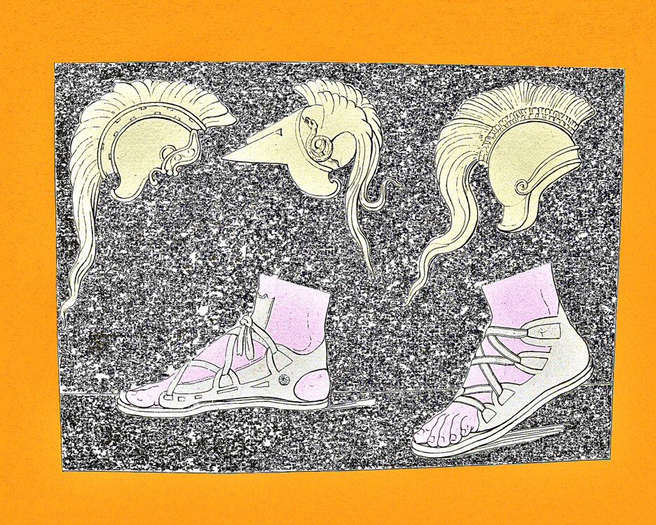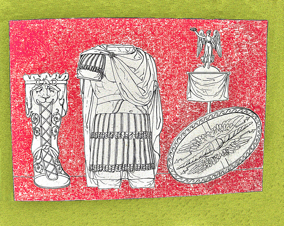 Collection of costumes from Egypt, Greece, Rome and other countries, a rare and precious book containing the engravings made in the late 18th century by Giovan Battista Romero. The engravings reflect the antiquarian taste of the time and were purchased by foreign travelers in Italy, one of the favorite destinations of the Grand Tour. Romero, whose workshop was located in the Piazza di Spagna, reproduced images taken from the bas-reliefs of the monuments of antiquity, with a focus on the weapons and armor worn by the armies of the various peoples: swords, dagger, armour, pilum, shoes, shields, helmets.
